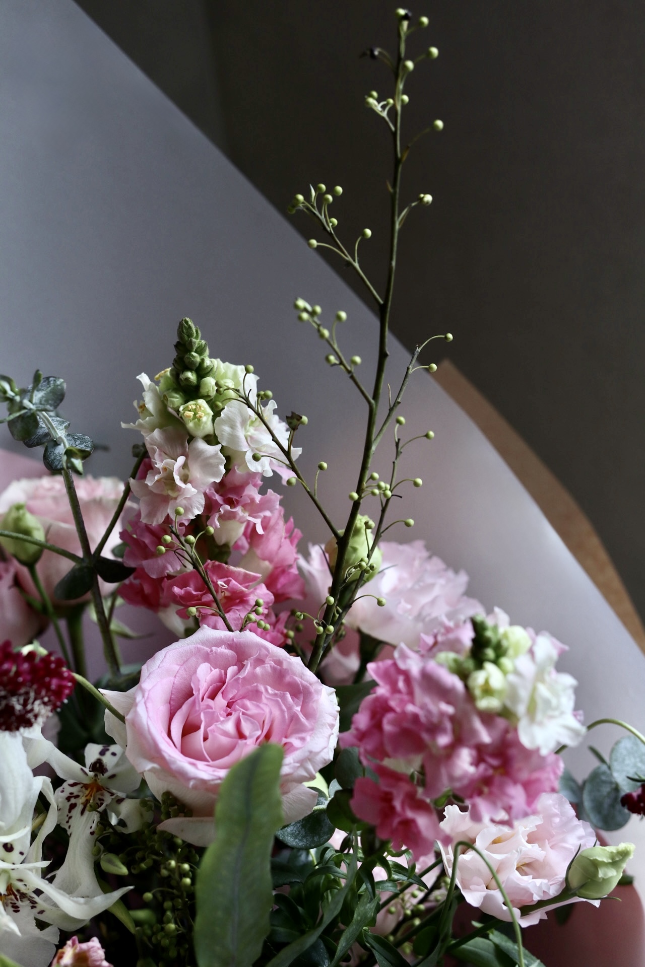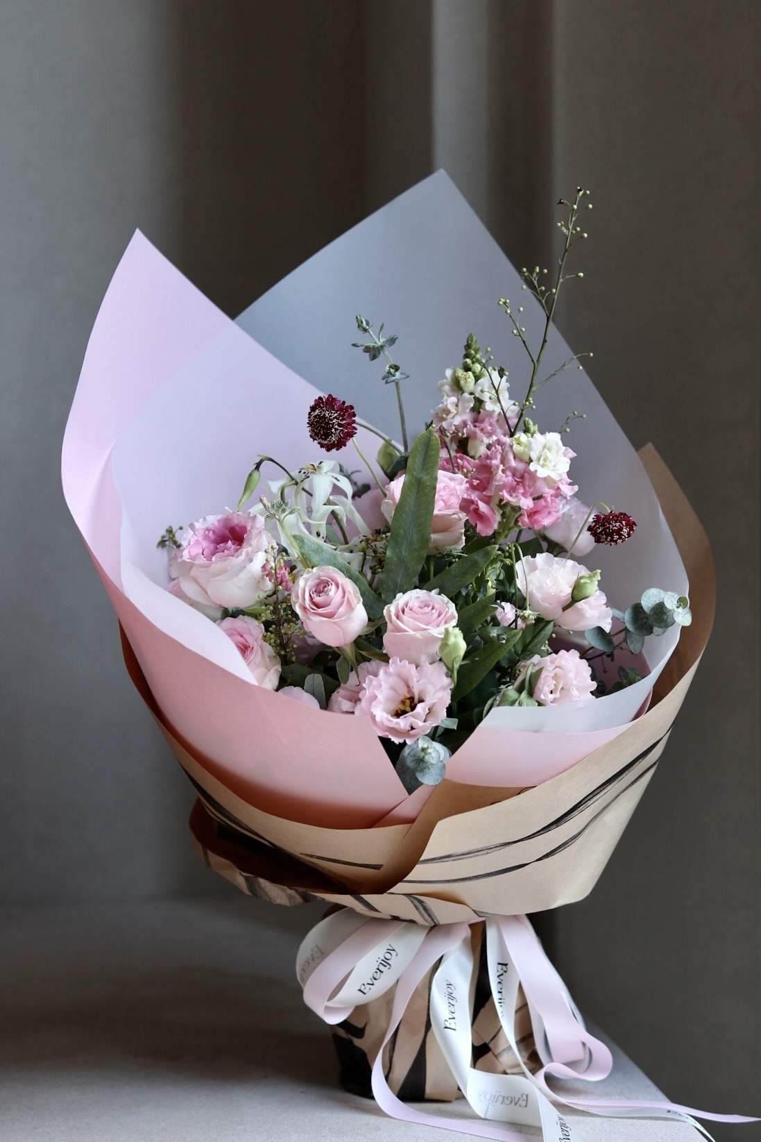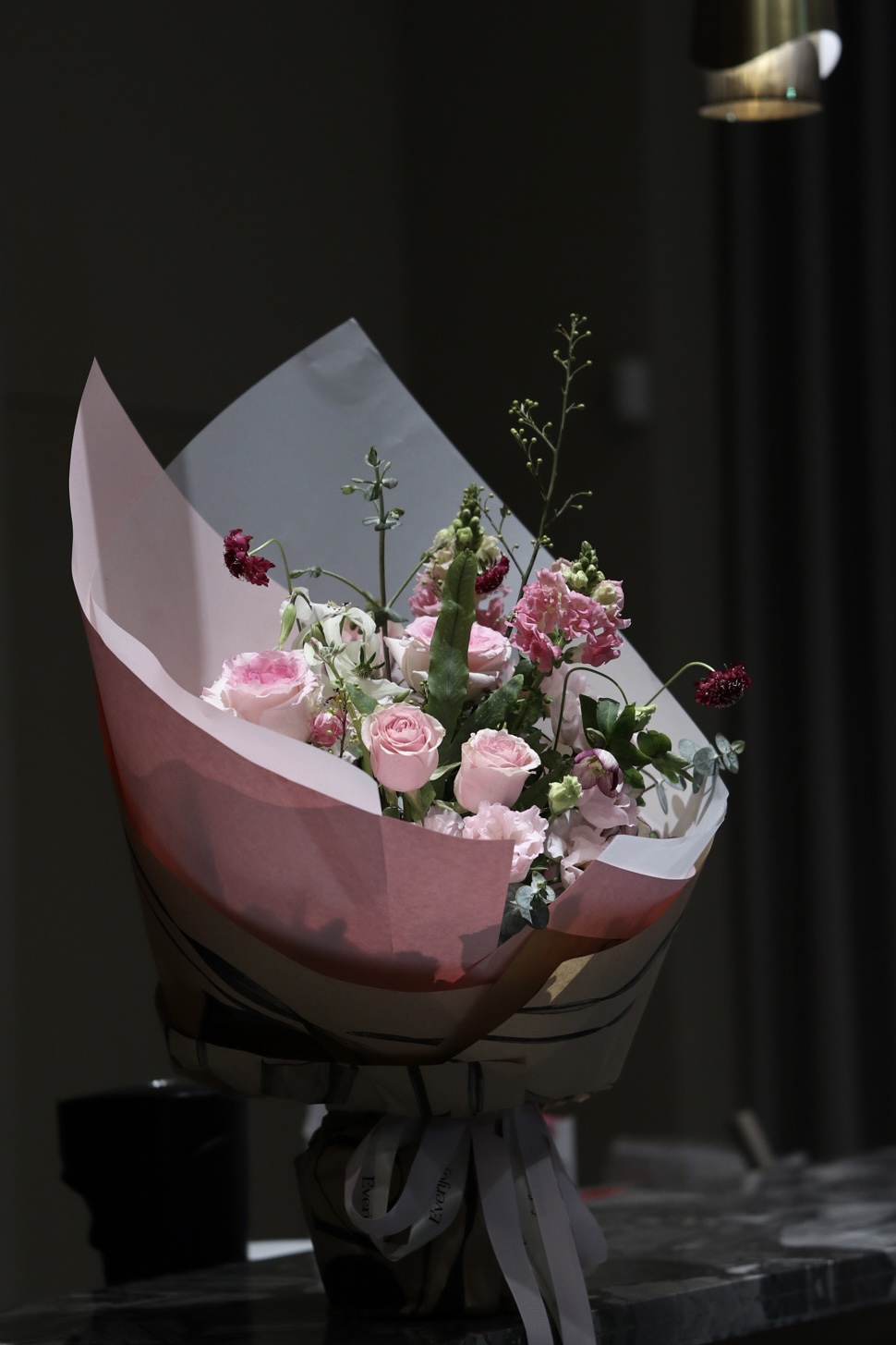 層疊的粉玫瑰、細緻的季節花材與輕盈綠意,像一段被細心呵護的關係,低調而真實,始終在心裡盛開。