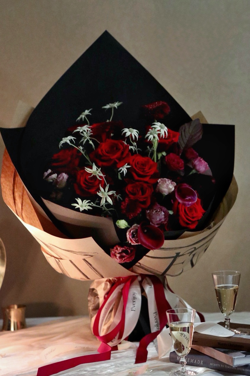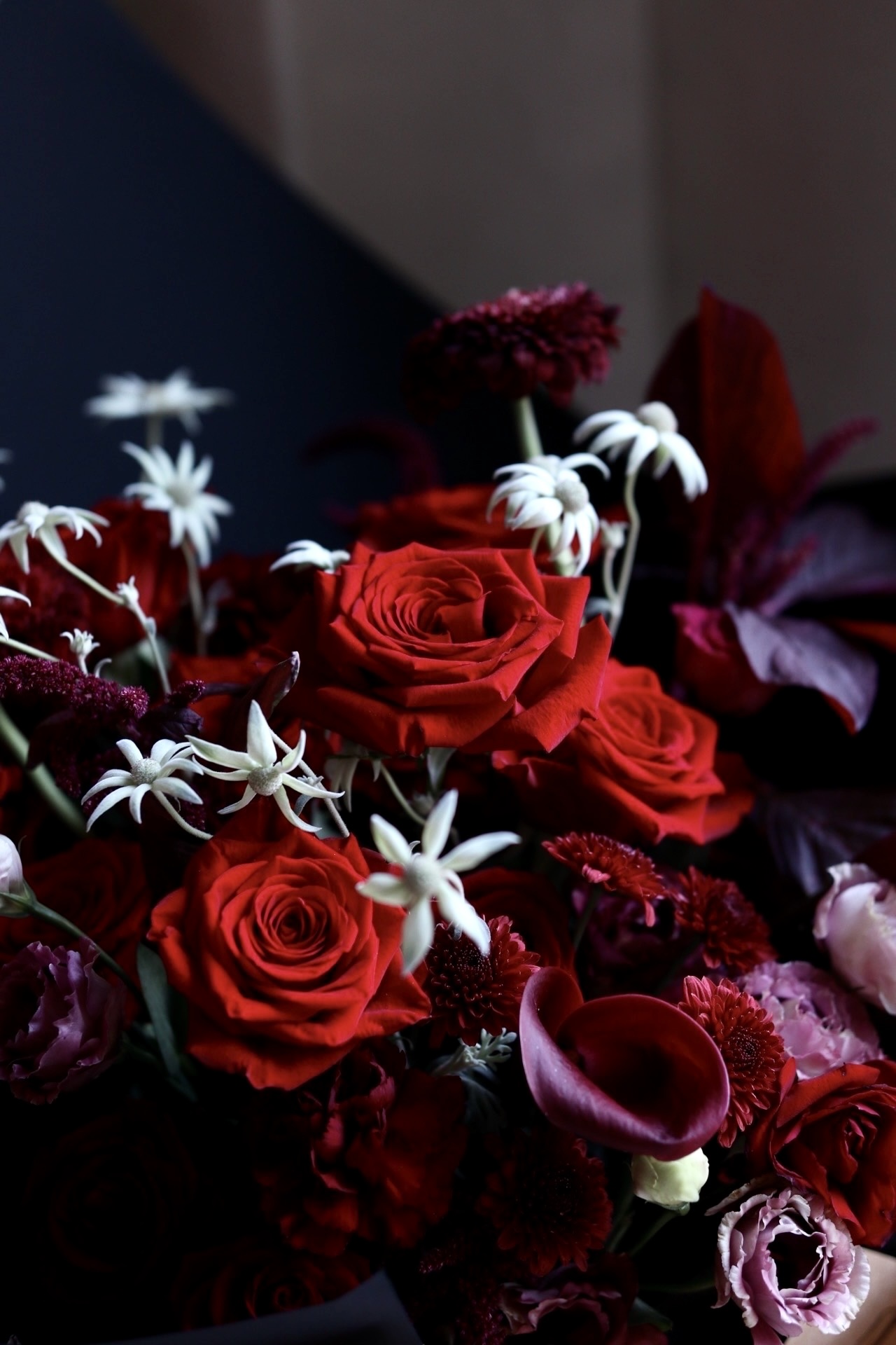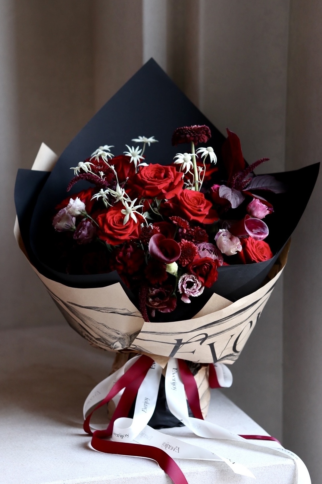 深紅玫瑰交織酒紅與細白花材,層次分明,如同成熟而真誠的情感,熱烈、專注,且從容自信。